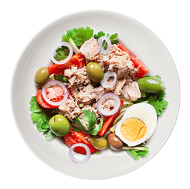 Salades, thon, oeuf, olives, poivrons + Sauce au choix.